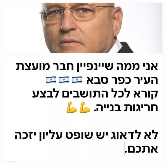חבר מועצת העיר, בכפר סבא, ממה שיינפיין העלה את הפוסט הבא לפיו כתב "אני ממה שיינפיין, חבר מועצת העיר בכפר סבא, קורא לכל התושבים לבצע חריגות בניה.
