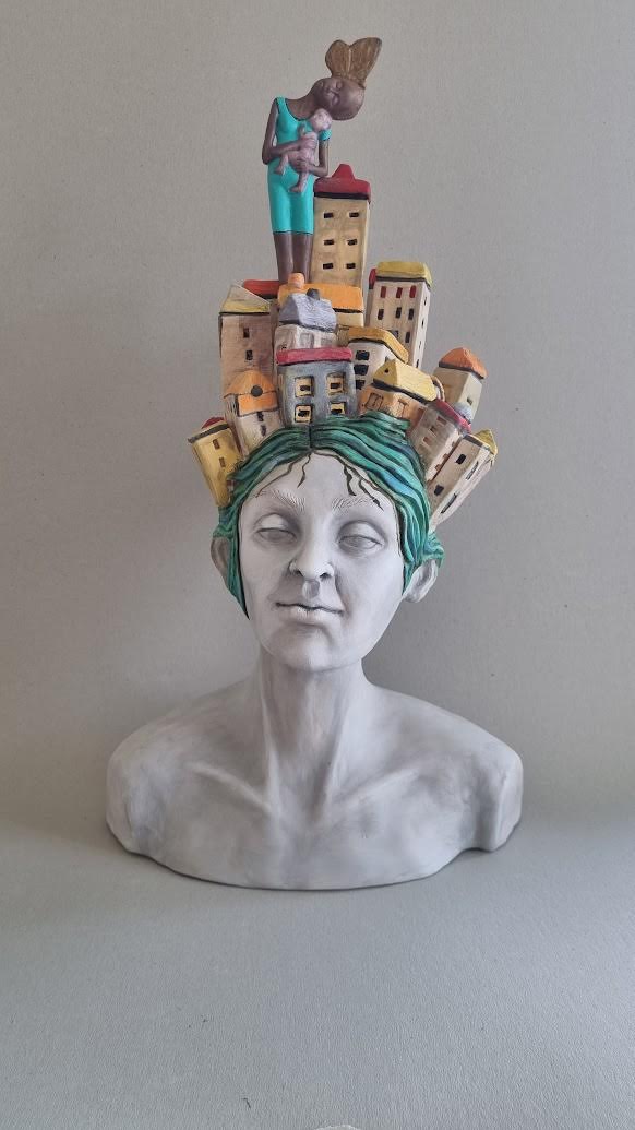 אומנית רב- תחומית, בוגרת שני תארים באומנות, חוקרת חומר וזהות, חברה בקולקטיב 'חפרפרת' ובעמותת 'אמן בעירו', מפיחה נשמה בשרידי חומרים. פועלת בשדה הציור והפיסול, משלבת חומרים בלתי שגרתיים, מחברת בין תהליכים איטיים, זיכרון אישי ועולמות מטאפיזיים. הפסל 'שורש ורוח', דמות קרמית מחומר שרוף עם מנגן, משולבת בראשה ענפי עלי תמר. העבודה עוסקת בזהות, שורשים והתמרות רוחניות דרך חומרי אדמה וטבע.