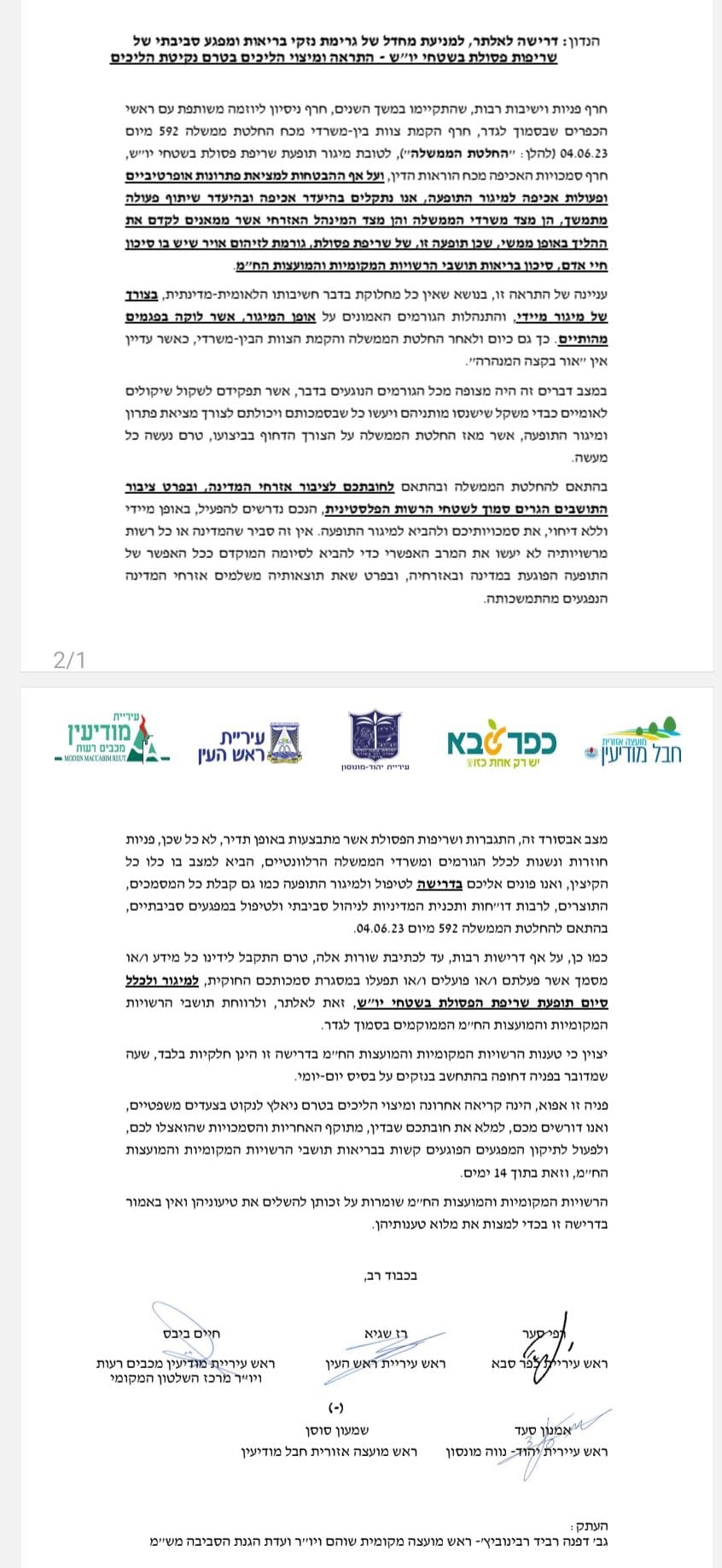 בפניה הדחופה עליה חתומים ראשי הערים מכפר סבא, רפי סער, חיים ביבס ועוד, שנשלחה לשר הבטחון ישראל כץ ושר הבריאות חיים כץ, נדרשים אלה לפעול נגד המפגע הסביבתי הגורם לנזקי בריאות, כמופיע למטה במכתב הרצ"ב