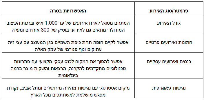 | מיקום אסטרטגי עם נגישות מהירה מירושלים ומתל אביב, נקודת מפגש מושלמת למשתתפים מכל הארץ | נגישות גיאוגרפית |