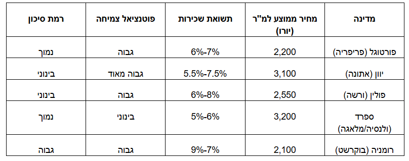 - רומניה: בוקרשט מציעה את התשואות הגבוהות ביותר ביבשת (9%-7%) אבל היא דורשת ניהול מקומי הדוק והבנה של הסיכונים הרגולטוריים.
